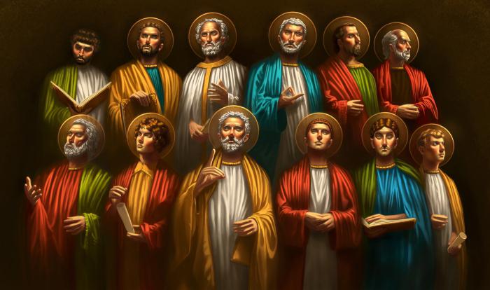Двенадцать апостолов Христа, или просто Его ученики, были обычными людьми, среди которых числились люди абсолютно разных профессий, и совершенно непохожие друг на друга, ну разве что они все были духовно богаты — эта черта их объединяла. В Евангелии очень ярко показаны сомнения этих двенадцати юношей, их борьбу с самими собой, своими мыслями. И их можно понять, ведь им фактически пришлось посмотреть на мир под совершенно другим углом. Но после того как двенадцать апостолов стали свидетелями вознесения Иисуса на небо после распятия, их сомнения сразу ушли. Святой Дух, осознание существования божественной силы сделал из них набожных, твердых духом людей. Собрав волю в кулак, апостолы готовы были возмутить весь мир.