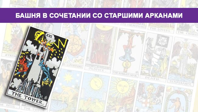 Для того, чтобы более глубоко и развернуто трактовать гадание, необходимо акцентировать внимание не только на каждом конкретном аркане, но и на их сочетаниях. Это поможет увидеть более полную картину происходящего. Таро Башня — сочетание с другими старшими арканами: