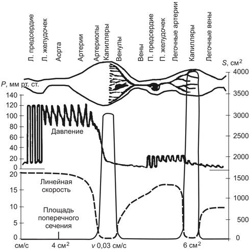 Рис. 1. Изменения давления крови, линейной скорости кровотока и площади поперечного сечения в различных участках сосудистой системы