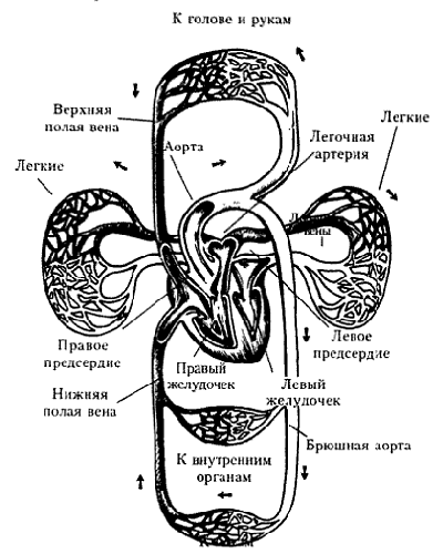 Нормальный обмен веществ в организме обеспечивается непрерывным движением крови. Кровь в сердечно сосудистой системе тенет только в одном направлении: от левого желудочка через большой круг кровообращения она поступает в правое предсердие, затем в правый желудочек и далее через малый круг кровообращения возвращается в левое предсердие, а из него — в левый желудочек. Это движение крови обусловливается работой сердца благодаря последовательному чередованию сокращений и расслаблений сердечной мышцы.