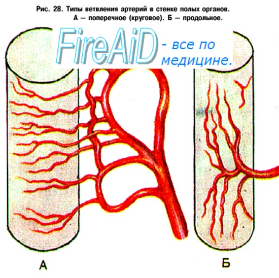На пути к органу или в самом органе артерии ветвятся на более мелкие сосуды. Различают магистральный тип ветвления артерий и рассыпной. При магистральном типе
