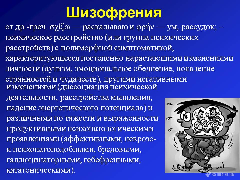 В отечественной психиатрии шизофрения — это «хроническое эндогенное заболевание, проявляющееся различной негативной и позитивной симптоматикой, и характеризующееся специфическими нарастающими изменениями личности».