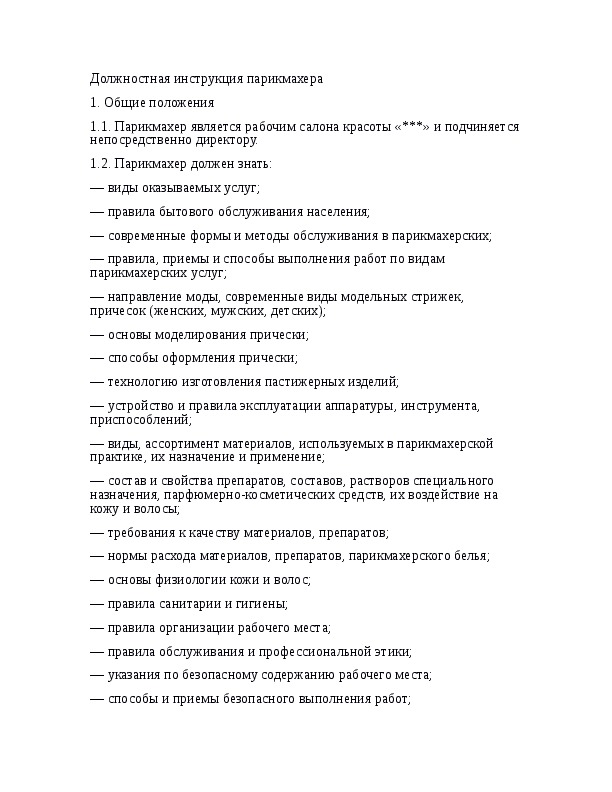 1.4. В своей практической деятельности парикмахер руководствуется настоящей должностной инструкцией и распоряжениями руководителя предприятия.