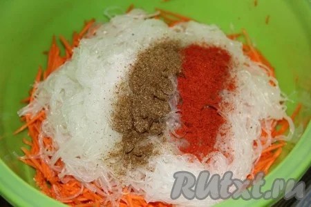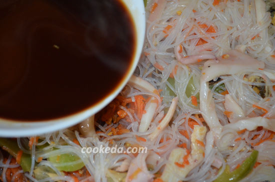 - Фунчозу заправляем ложкой розового уксуса, тщательно перемешивая.