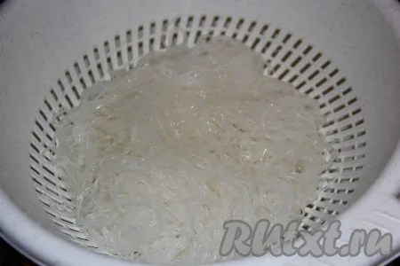- Стеклянную лапшу заливаем крутым кипятком и завариваем несколько минут. Затем сливаем в дуршлаг (воду не выливать).