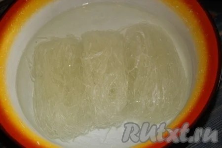 1. Прозрачную лапшу фунчозу залить литром крутого кипятка. Оставить на пять минут. Слить кипяток. Лапшу промыть. Это нужно сделать под струей холодной воды. В данном случае используется лапша из крахмала бобовых культур.