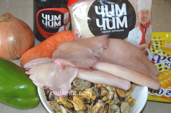 Для приготовления нам понадобятся следующие ингредиенты: граммов 500 фунчозы, столько же морепродуктов свежемороженых, пара луковиц, 50 граммов масла, полстакана молока, рисовый уксус, соевый соус, петрушка или кинза (или и то и другое), большой огурец, парочка сладких и один горький перчики.