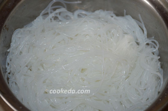 - «Стеклянную лапшу» заливаем крутым кипятком, оставляя на несколько минут. Затем воду сливаем, промываем вермишель под прохладной водой, отбрасывая ее на дуршлаг.