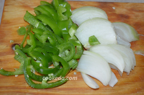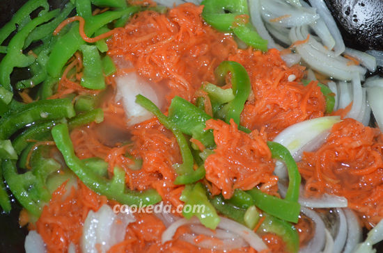 8. Обжарить лук, перец и морковку в горячем масле 2-3 минуты.