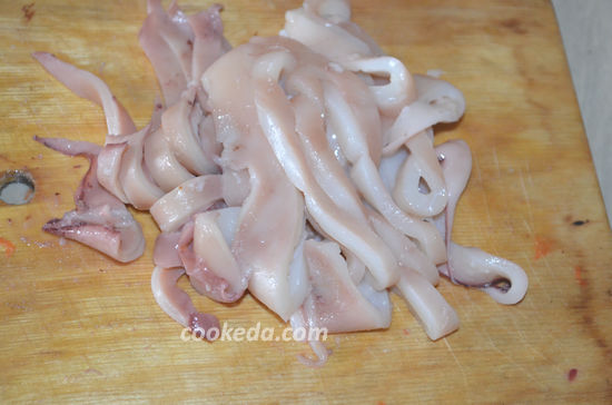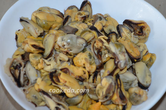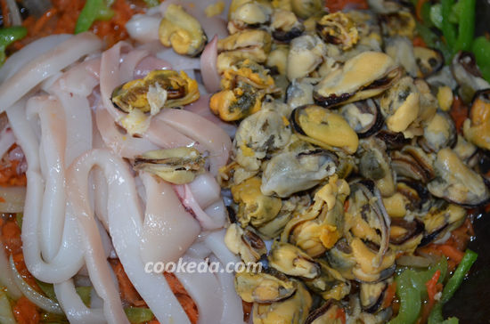 - Морепродукты размораживаем. Очищаем от панцирей и ненужных фрагментов, если есть таковые. Моем в проточной воде.