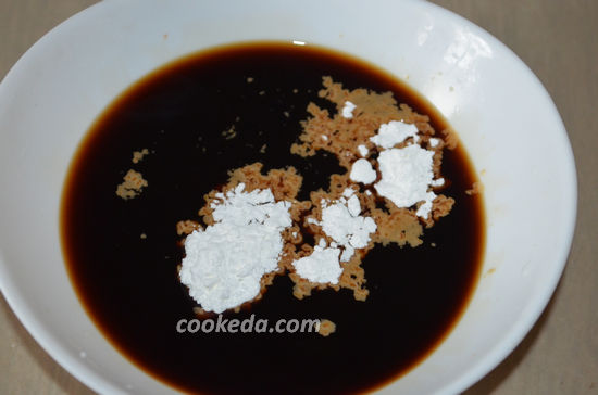 - Из чеснока, имбиря, чили, сахара и жидких компонентов смешайте заправку.