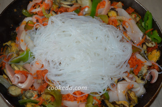 10. В течение 2-3 минут обжарить морепродукты с овощами, добавить к ним фунчозу.