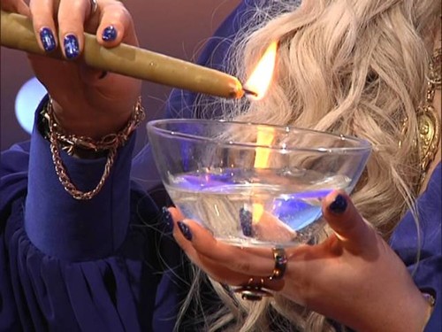 Для этого гадания понадобятся две восковые свечи, одну из них необходимо зажечь, а куски другой положить в ложку и нагреть ее над горящей свечей, пока не растопится воск. Потом воск быстро выливается в стакан, наполненный холодной водой. По фигуре, которая образовалась из воска, можно рассказать о будущем.