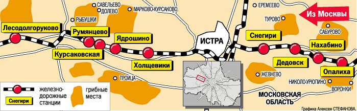 Расположена среди светлого соснового бора. Это культовое место подмосковных грибников. Еще на подъезде к станции можно увидеть их, блуждающих среди высоких стволов. Выходя на станцию, вы практически сразу оказываетесь в лесу. Среди сосен можно искать маслята и лисички. Свинушки тоже любят хвойный лес, но их собирать не рекомендуется: эти грибы очень быстро впитывают вредные вещества. Или берите молодыми, или вообще откажитесь от них.