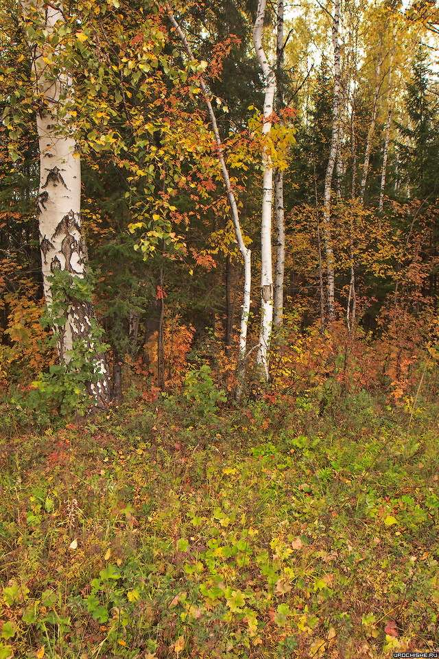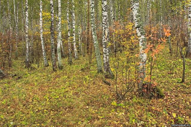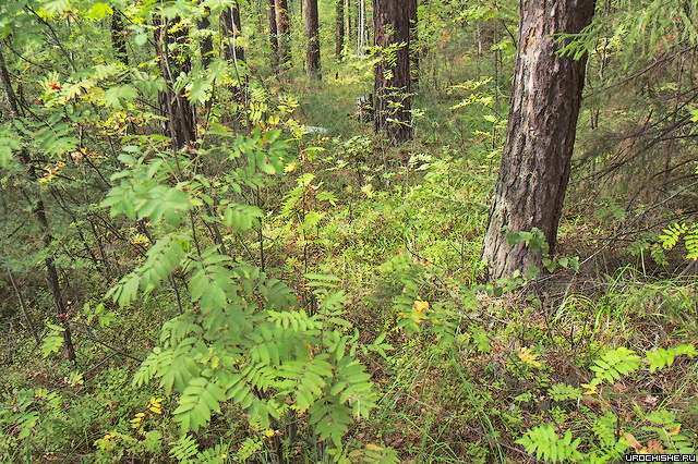 Фото 3. Типичное грибное место: неплотный березняк с хорошо развитым рябиновым подлеском, с моховыми участками и жиденьким травяным покровом, состоящим из луговых трав и костяники, а также с небольшими перепадами рельефа (возвышенностями, ложбинками) и прогалинами. В нескольких метрах от этого места течёт река. Виды грибов, произрастающие в таком лесу: лисичка, груздь, опёнок, подберёзовик, белый гриб.