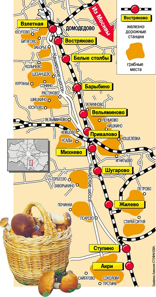- По обе стороны от железнодорожных путей станций «Вельяминово», «Привалово» и «Михнево» в радиусе 3 км также много грибов разных мастей.