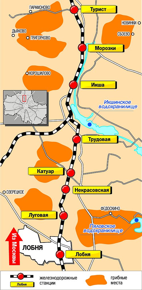 - Если выйти на станциях «Морозки» и «Турист» и отправиться в сторону Новлянки, Парамоново и Григорково, можно найти места, богатые лисичками, белыми грибами и маслятами.