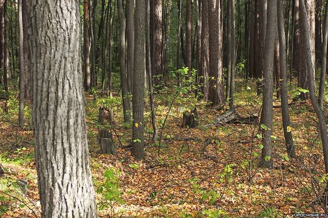 Фото 6. Типичный лес, часто посещаемый человеком (находится недалеко от большого города). Травяной покров вытоптан, подлесок чахлый, видны тропы и места рубки деревьев. Посреди леса валяется всякий хлам. Сейчас искать грибы здесь бесполезно, однако в прошлом этот лес наверняка был хорошим грибным местом.