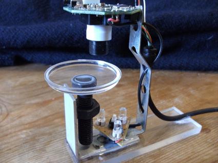 Наш микроскоп из веб-камеры почти готов. Теперь обязательно нужно подсветить предметный столик снизу. Если вы не нашли ничего подходящего, воспользуйтесь маленьким зеркальцем. Устройте его под столиком под углом так, чтобы оно отбрасывало зайчика от источника света на предметный столик. Источником света может быть или фонарик.