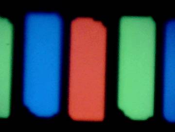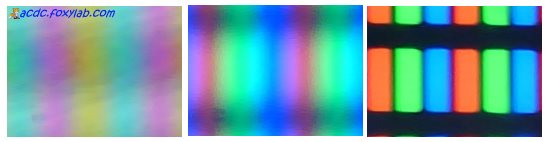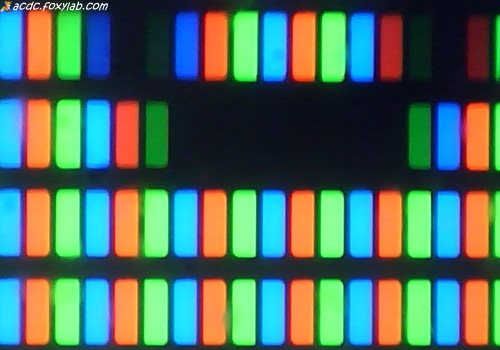 На левом изображении видно, что ширина промежутка между красными и синими пикселями больше, чем между синими и зелеными и между зелеными и красными. Но изображение перевернуто, т.е. истинный порядок следования субпикселей RGB