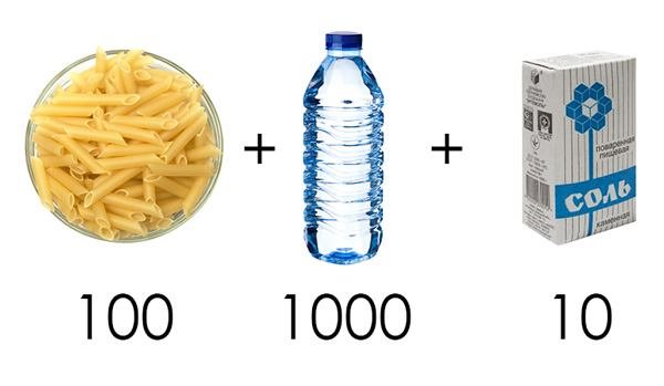 Берем кастрюлю и наполняем ее водой: на 100 г макаронных изделий – 1 литр воды. Если воды добавить меньше, то макароны получатся клейкими. На одну порцию, как правило, нужно 100 г макарон. Т.е. для семьи из трех человек нужно готовить 300 г. макарон в кастрюле объемом 3 литра.