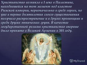 язык. С точки зрения служителей культа, главной и единственной причиной возникновения христианства была проповедническая деятельность Иисуса Христа, который был одновременно и Богом, и человеком. Иисус Христос в образе человека пришёл на землю и принёс людям Истину