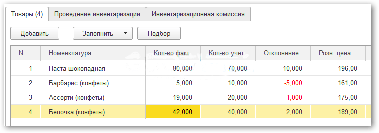 В колонке «Учет. количество» указан остаток товара на складе по данным программы, а в колонке «Количество» вы должны заполнить фактический остаток товара на складе. В колонке «Отклонение» программа рассчитает отклонения фактического остатка от учетного: