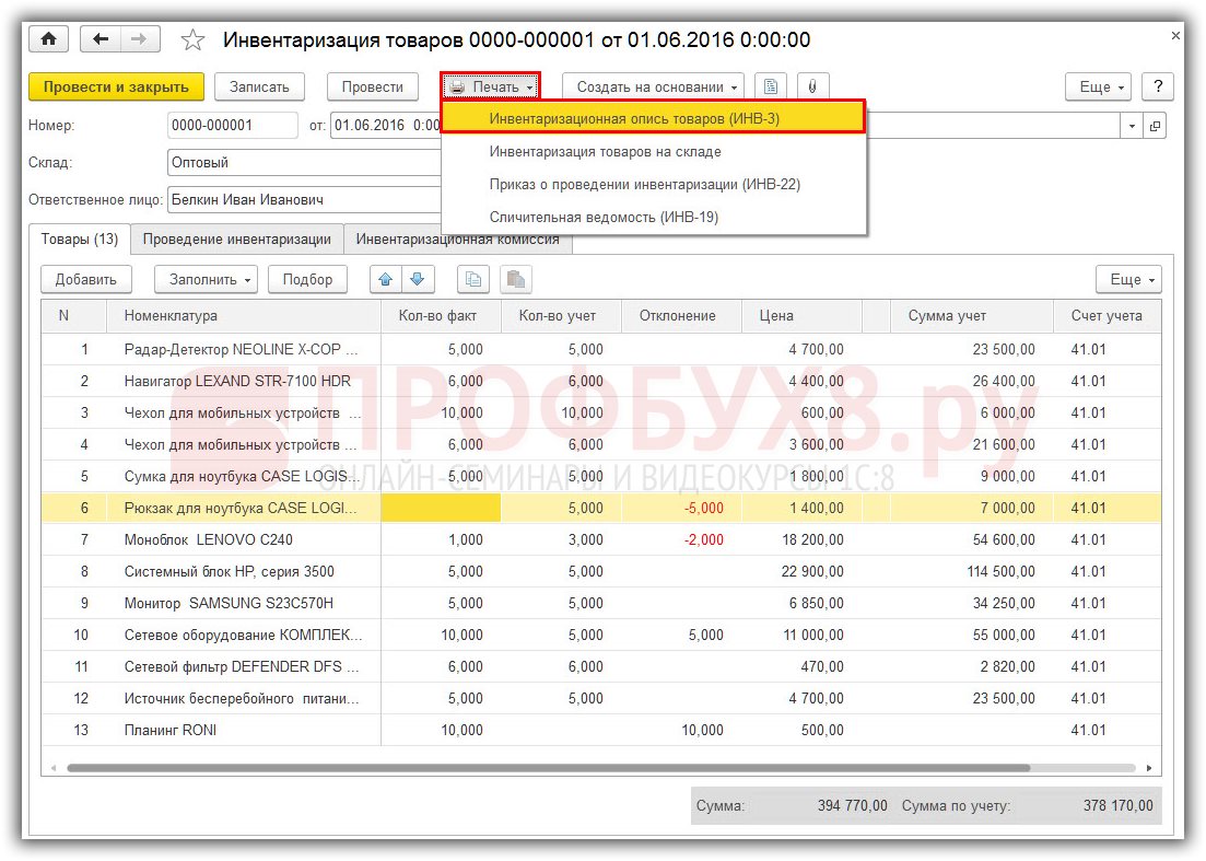 Как проходит инвентаризация в программе 1С 8.3 Бухгалтерия 3.0 и как по её итогам списать или оприходовать товар.