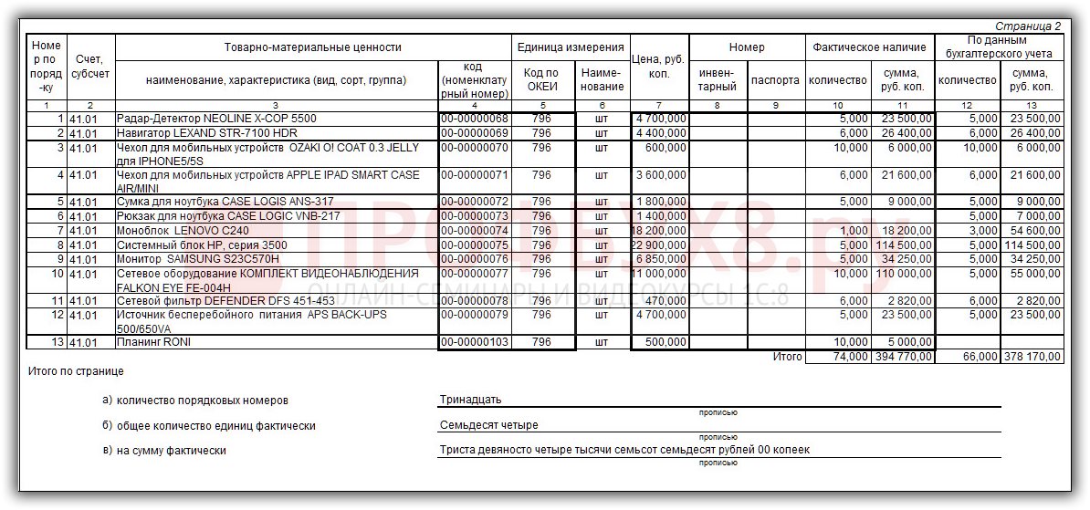Пример заполнения страницы 2 отчета Инвентаризационная опись товаров (ИНВ-3):