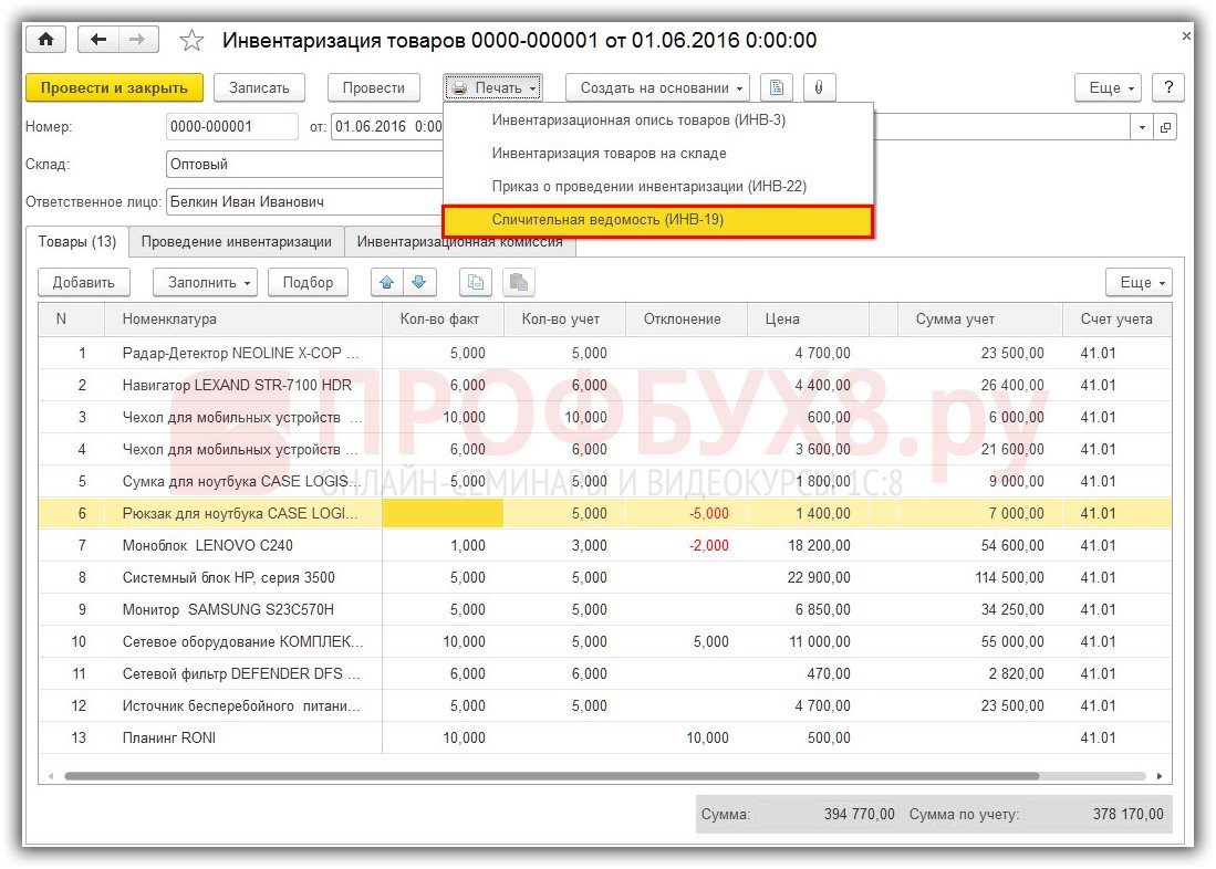 Если по итогам инвентаризации были обнаружены расхождения между учетными и фактическими данными, то в 1С 8.3 можно сделать сличительную ведомость по форме ИНВ-19.