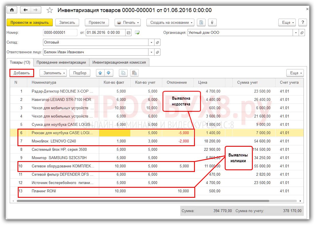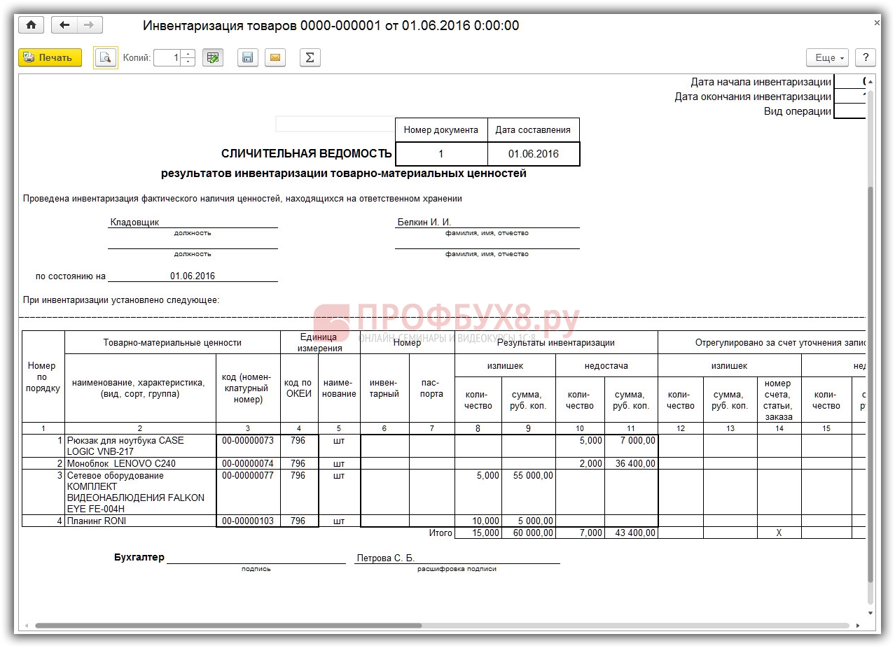 Недостача ТМЦ при инвентаризации в 1С 8.3