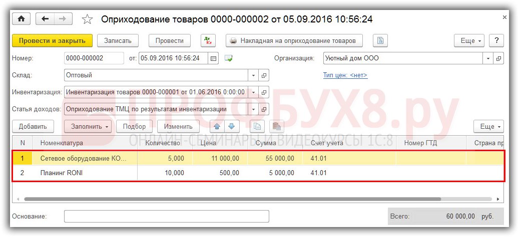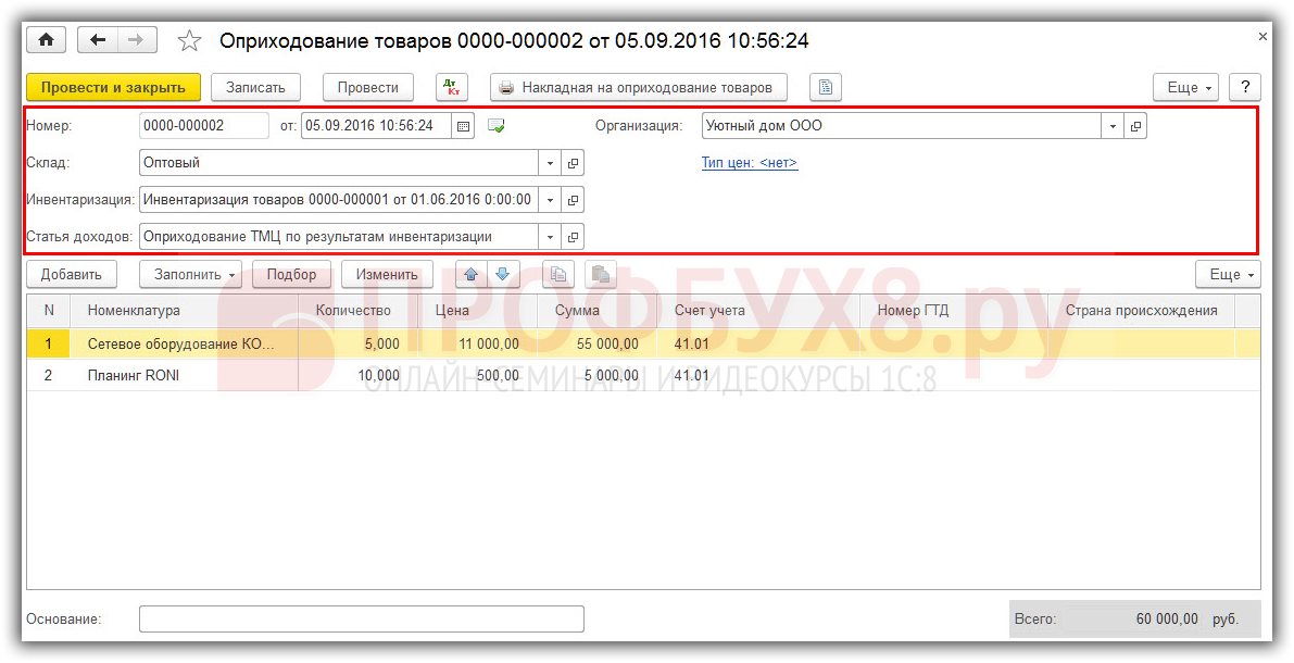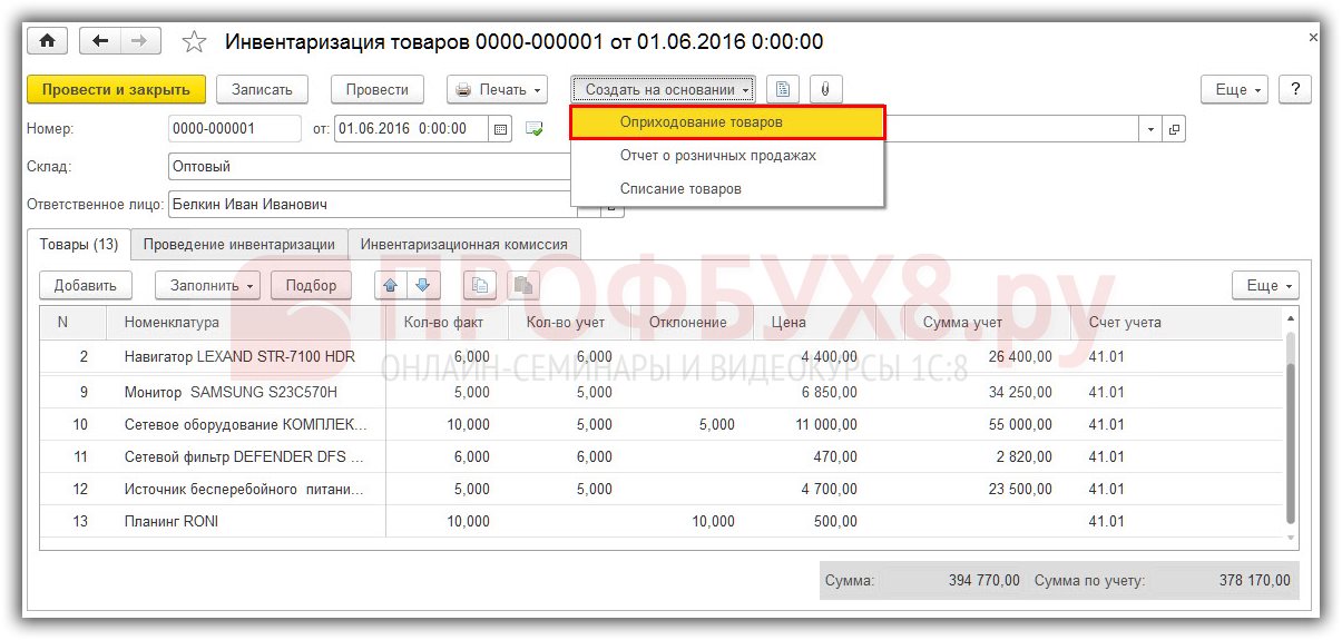 Оприходование товаров на основании данных по инвентаризации