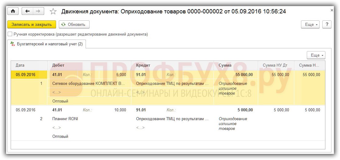Так же фиксируем данные кнопкой «Провести». Проверяем проводки в 1С по оприходованному товару: