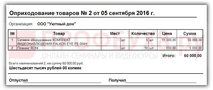 Выводим на печать накладную, щелкнув по кнопке Накладная на оприходование товаров