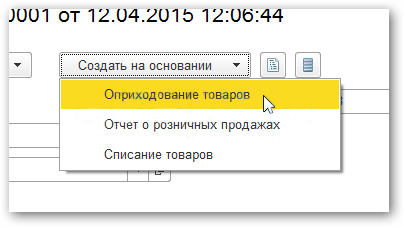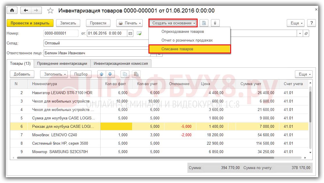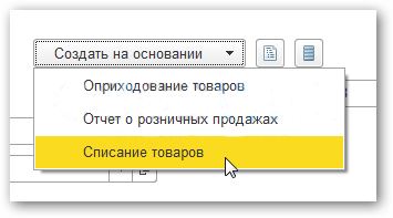 Нажимаем в «Инвентаризации» кнопку «Создать на основании» — «Списание товаров»: