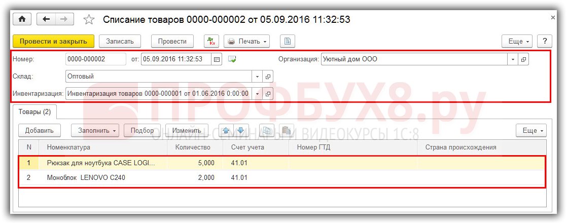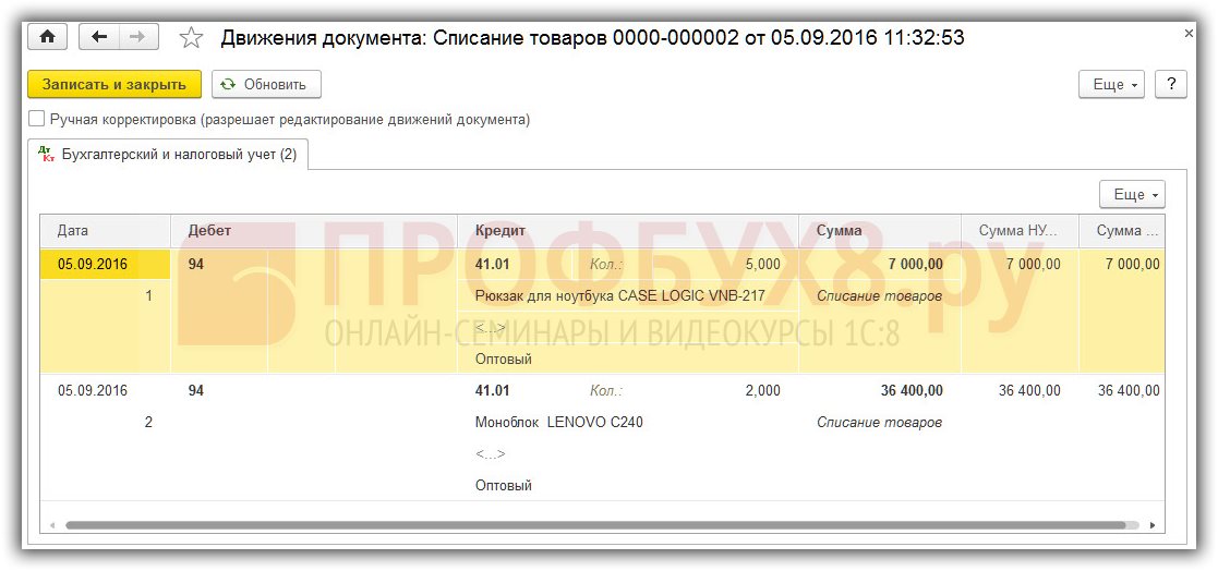 Шаг 2. Проведение документа Списание товаров