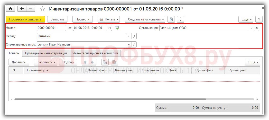 - Создание и заполнение документа инвентаризации. Он служит для заполнения фактических данных о наличии или отсутствия номенклатуры на складе. Документ не делает никаких проводок.