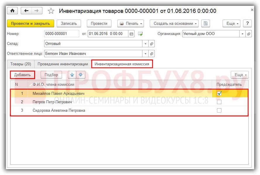 На закладке Инвентаризационная комиссия,