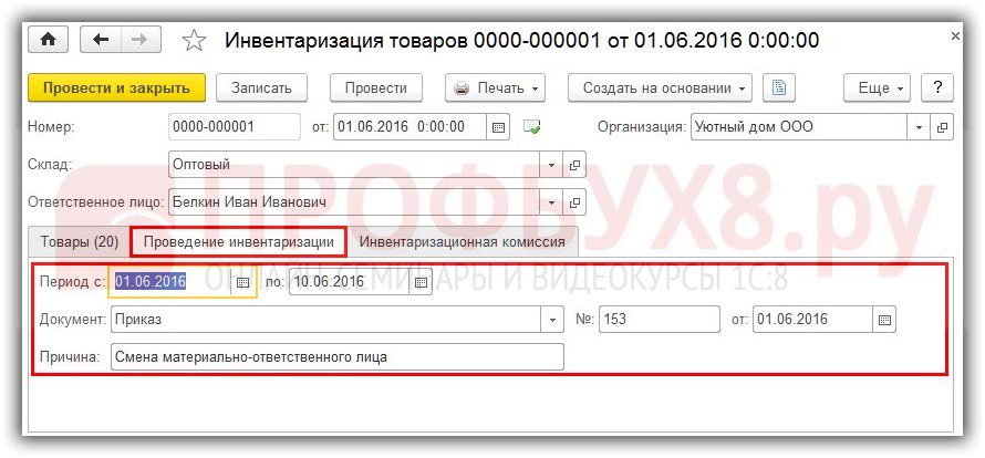Заполняем закладку Проведение инвентаризации