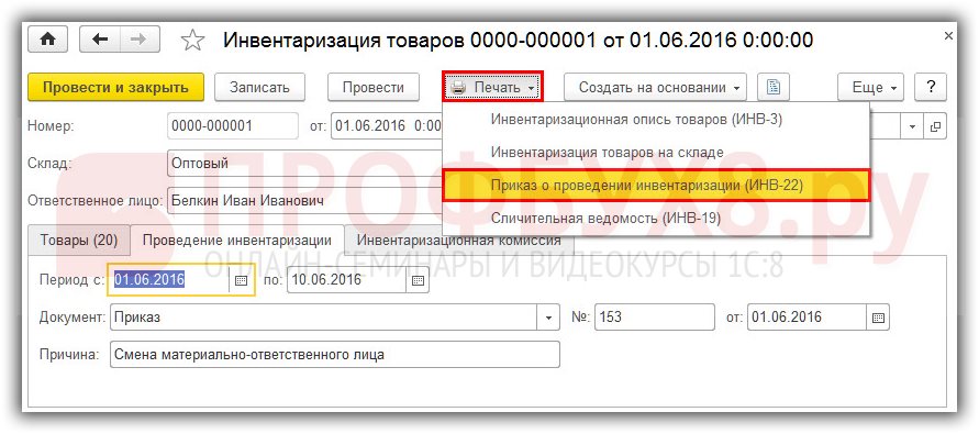 можно создать печатный вид Приказа о проведении инвентаризации (форма №ИНВ-22):