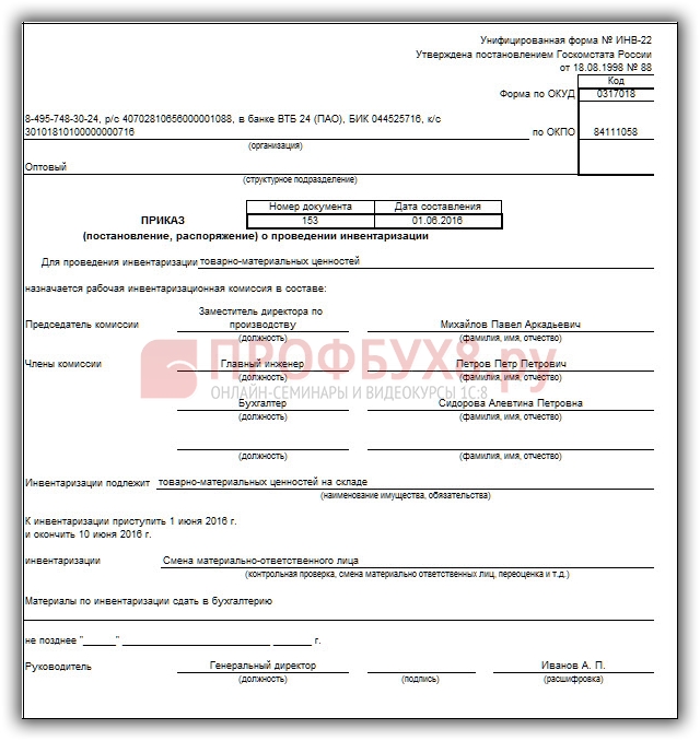 - Приказ о проведении инвентаризации — ИНВ-22