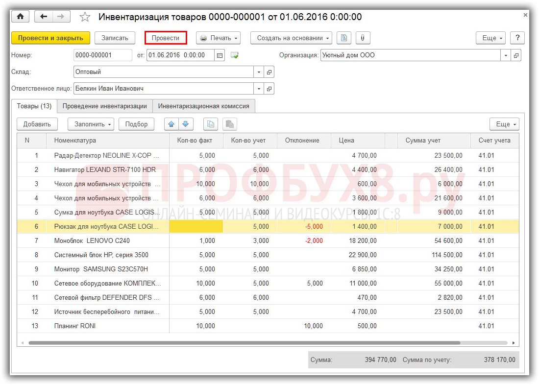 Если вы обратили внимание, сама инвентаризация никаких проводок в бухгалтерский учет не производит. Теперь необходимо списать или оприходовать товар, который в этом нуждается.