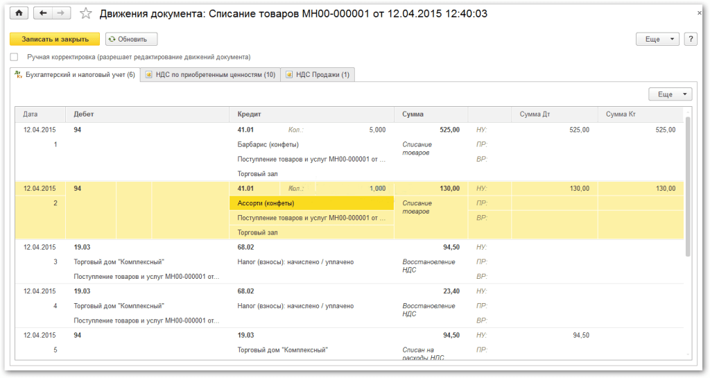 Если всё верно — просто нажмите кнопку «Провести». Проверим проводки по списанию: