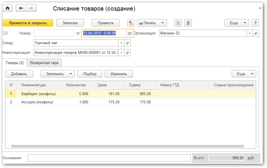 Заполнение документа Списание товаров: