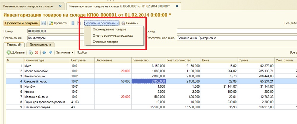 Программа 1С Бухгалтерия 8.3 автоматически сформирует списание по позициям, у которых была недостача: