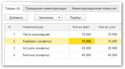 Шаг 2. Заполнение таблицы документа Инвентаризация товаров