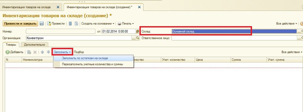 Создадим новый документ инвентаризации. Прежде всего в документе указывается склад, на котором проводится инвентаризация, и организация, которой принадлежат товары: