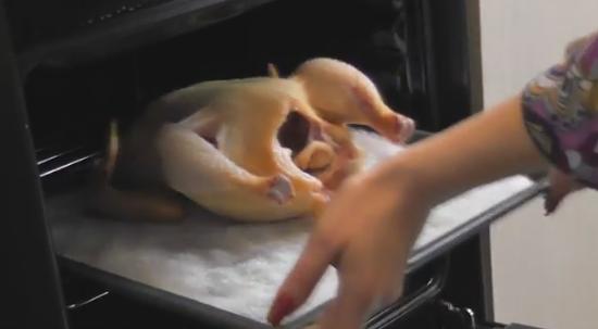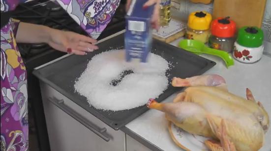 3. Третий метод создает хрустящую корочку с помощью соли. Берем 1 килограмм соли равномерно распределяем его по противню, сверху на него укладываем дольки курочки шкурой вниз, затем отправляем противень в духовку и запекаем до готовности. Если Вы выберете данный метод, то помните, что курицу солить нельзя — она сама возьмет соли столько, сколько надо и ни грамма больше.