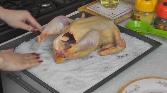 2. Курицу солить дополнительно и перчить не нужно. Просто положите ее на соль и курица сама возьмет в себя и впитает столько, сколько нужно.