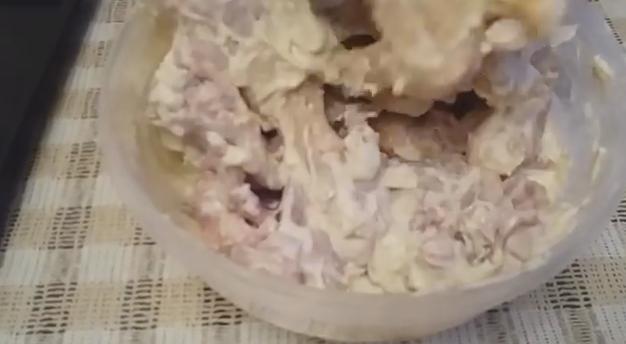1. Первым делом замаринуйте куриное мясо. Для этого смешайте майонез с порезанным на полукольца луком и рубленным чесноком, внесите соль и перец, а также приправы (например хмели-сунели или паприка, карри) и специи. Размешайте. Поместите куриные куски в этот маринад. Оставьте мариноваться хотя бы на 1 час в прохладном месте.